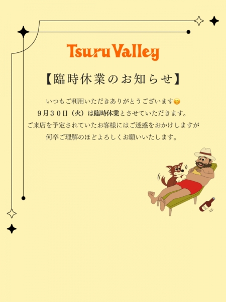9月30日(火)は臨時休業とさせていただきます。ご来店を予定されていたお客様にはご迷惑をおかけ...